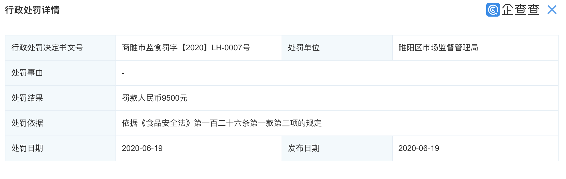 企查查消息显示,该公司存正在诸多取食物平安相关的行政惩罚。其曾于2021-10-09年运营无标签的预包拆食物、食物添加剂或者标签、仿单不符律、律例的食物、食物添加剂,被涪陵区市场监视办理局责令罚款。