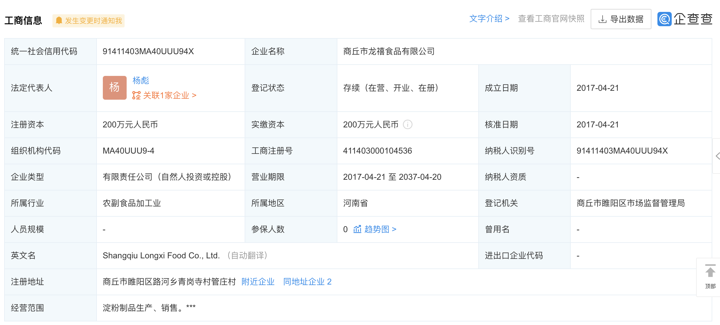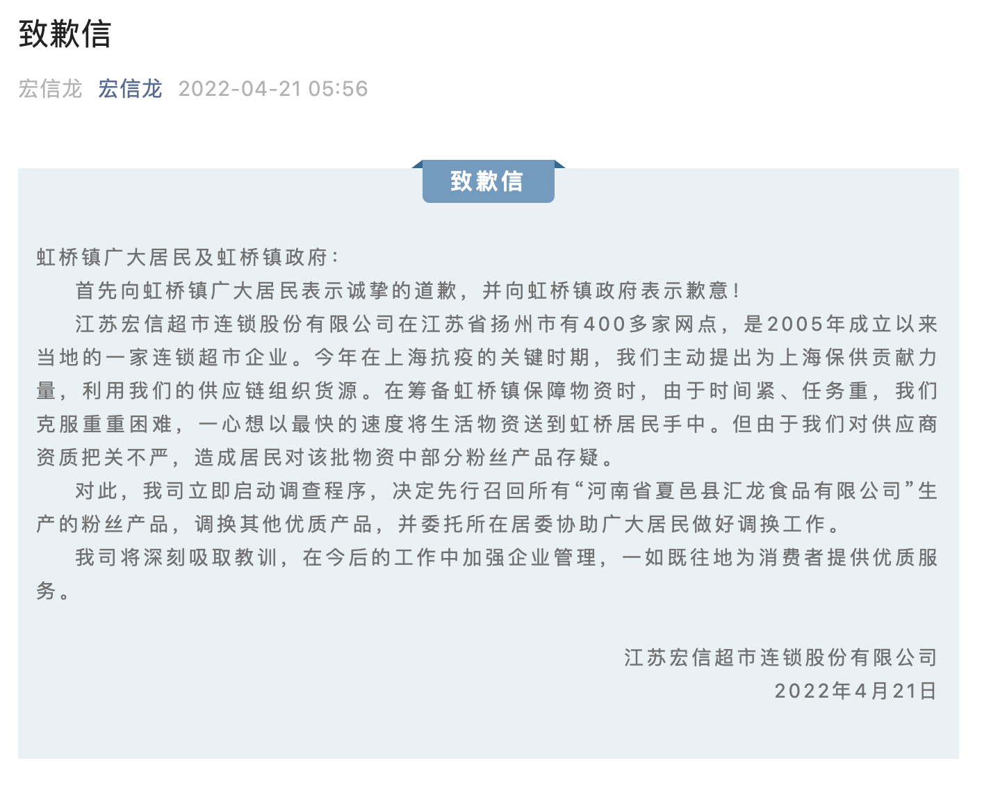 商丘市龙禧食物无限公司成立于2017年,代表报酬杨彪。注册本钱为200万元人平易近币,企业地址位于商丘市睢阳区河乡青岗寺村管庄村,运营范畴包含:淀粉成品出产等。据企查查消息显示,该公司于2020年根据《食物平安法》第一百二十六条第一款第三项的被罚款9500元。2022年4月21日,江苏宏信超市连锁股份无限公司正在平台上颁发道歉信,信中称其对供应商天分把关不严,形成居平易近对该批物资中部门粉丝产物存疑。该公司决定先行召回所有“河南省夏邑县汇龙食物无限公司”出产的粉丝产物,互换其他优良产物,并委托所正在居委协帮泛博居平易近做好互换工做。