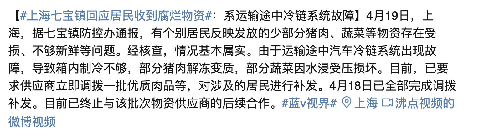 浦东新区东明街道向居平易近发放的抗疫物资涉及:楼老七榨菜。该物资涉嫌伪制出产日期,日期有点窜踪迹。发卖过时食物,风险人平易近身体健康平安;近日,有居平易近反映宝山高境发的物资中“精制白糖”没有出产商,商品袋上标注的分拆商正在企查查、爱企查等企业平台搜不到公司的任何消息。4月19日,据闵行区七宝镇居平易近反映,发放的猪肉等物资存正在受损、不敷新颖等问题,形成居平易近食用后呈现腹泻的情况。同时,也有居平易近指出发放猪肉的部位不合适国度食物平安相关,同时猪肉加工场也存正在如出产运营标签不合适尺度等违规消息。此次闵行七宝镇发放的猪肉,其包拆显示加工商为上海天容肉成品集团无限公司。企查查消息显示,该公司注册地址是上海市金山区亭林镇亭华158号,注册资金3000万人平易近币,法人代表为王天容。企查查消息显示,该公司存正在诸多法令风险,同时有13起相关司法案件。其曾于2019-21年期间多次因食物出产运营者未按照对变质、跨越保质期或者收受接管的食物进行标示或者存放等缘由收到行政惩罚,罚款金额从5万到17。9万元不等。4月19日,七宝镇防控办就物资中食物变题颁发声明。声较着示,变质是因为运输途中冷链呈现毛病所致,且已取该批次物资供应商终止合做。