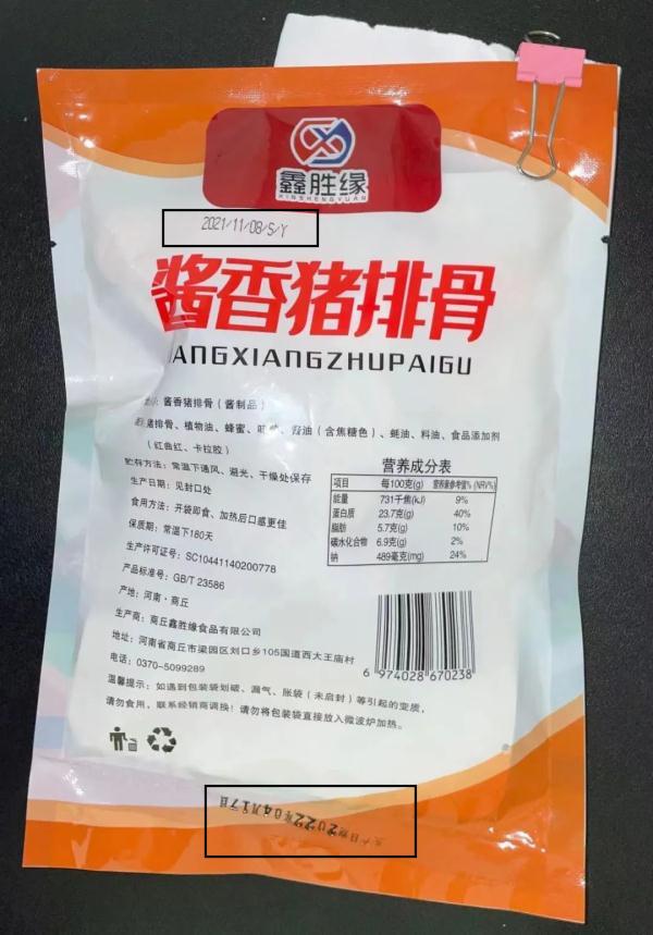 4月21日,杨浦区市场监管局接到江浦街道反映,当日发放的保供物资“酱喷鼻猪排骨” 涉嫌标注虚假出产日期。该款标称出产的“酱喷鼻猪排骨”包拆上印刻有两个出产日期,别离为“2021/11/08/S/Y”和“2022年4月17日”,保质期为常温下180天。