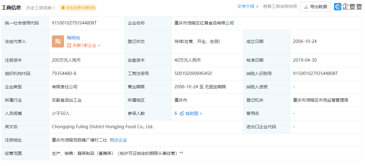宝山区高境镇居平易近收到的物资中包含“渝橙牌”涪陵榨菜。企查查消息显示,出产该产物的涪陵区红景食物无限公司曾因“出产运营超范畴、超限量利用食物添加剂的食物”等缘由被多次行政惩罚。